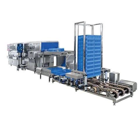 The high-pressure water spray basket cleaning machine is a continuous and fully automated cleaning system designed for the food processing industry. It is mainly used for washing baskets, trays, and various containers.
