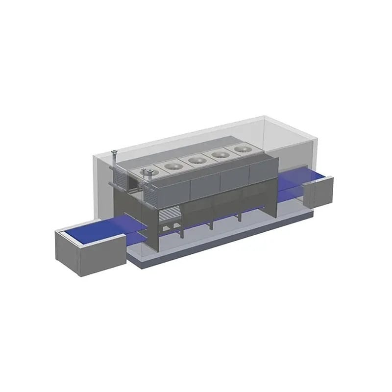 The impact freezer uses high-velocity air jets directed at the top and bottom surfaces of food products to remove the insulating air and thermal barrier surrounding them. Once this heat layer is eliminated, the products freeze faster. This process significantly reduces processing time, achieving freezing speeds comparable to low-temperature equipment, while operational costs remain similar to conventional machinery.