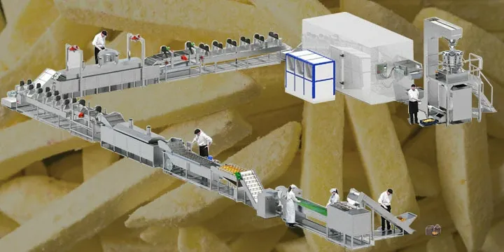 - Integrated washing, peeling, cutting, blanching, frying, de-oiling, freezing, and packaging